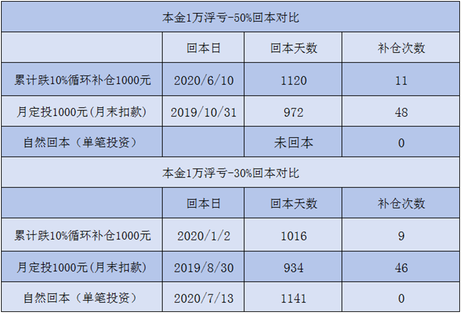相比之下,定投回本的实操难度明显低于逢跌补仓策略,但补仓资金的要求则更高,因此,在选择补仓路径的时候,投资者需要对未来的可投入资金的数量及频率做到心里有数,并结合自身投资习惯及优势进行选择,尤其需要防范“断供”回本资金从而影响回本计划。
