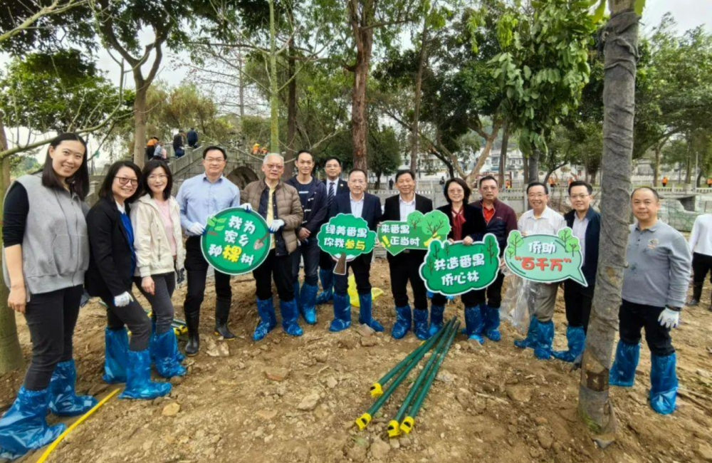 罗守弘(左五)参加“我为家乡种棵树,共造番禺侨心林”植树活动