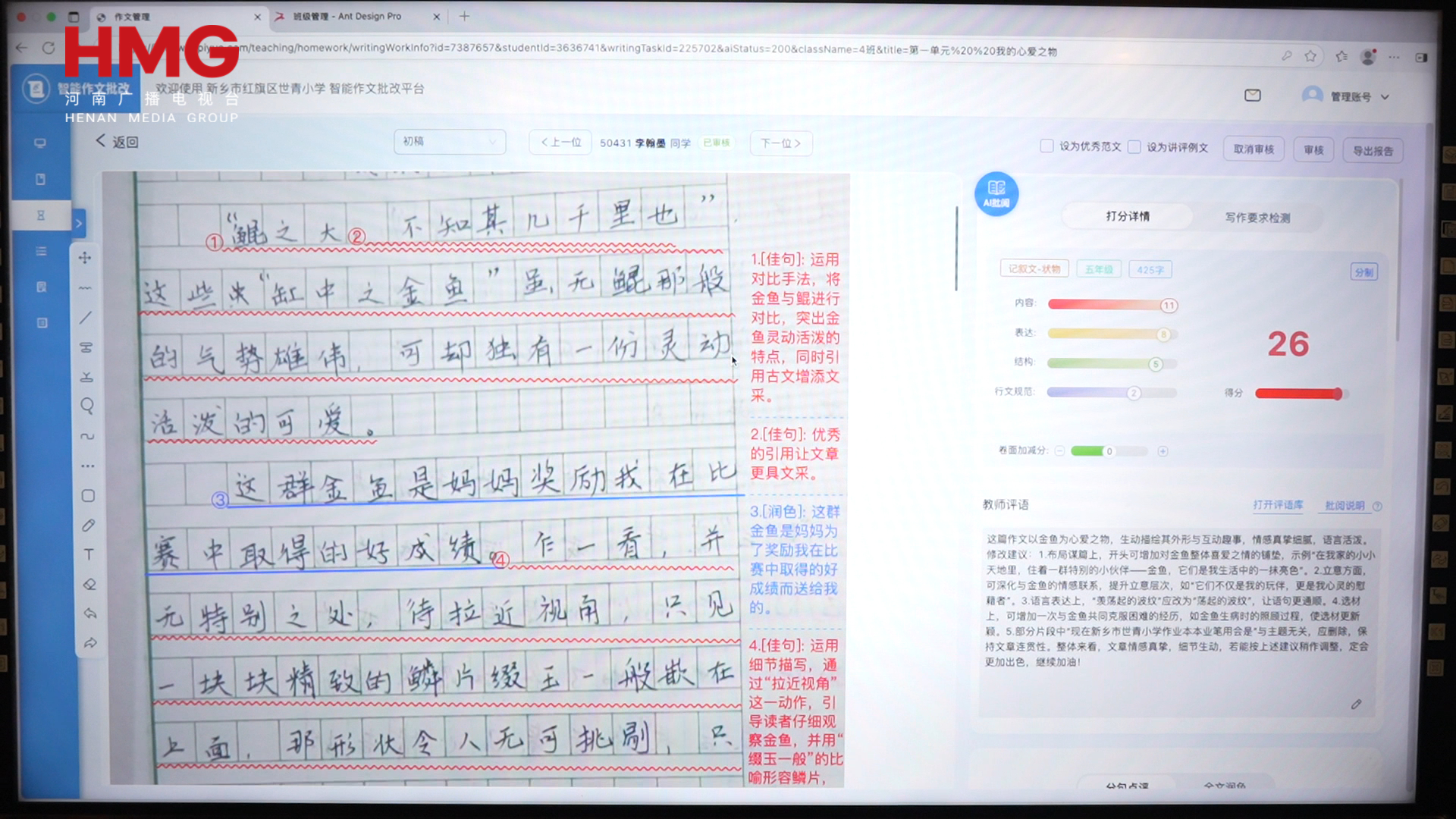 授课老师杜晓杨向记者介绍:“通过AI大模型的技术对作文进行逐字批改,包括诗词句篇章,结构内容等等的修改,形成每个学生的个性化报告,比人工批改在效率上基本上能提高到5到10倍。”
